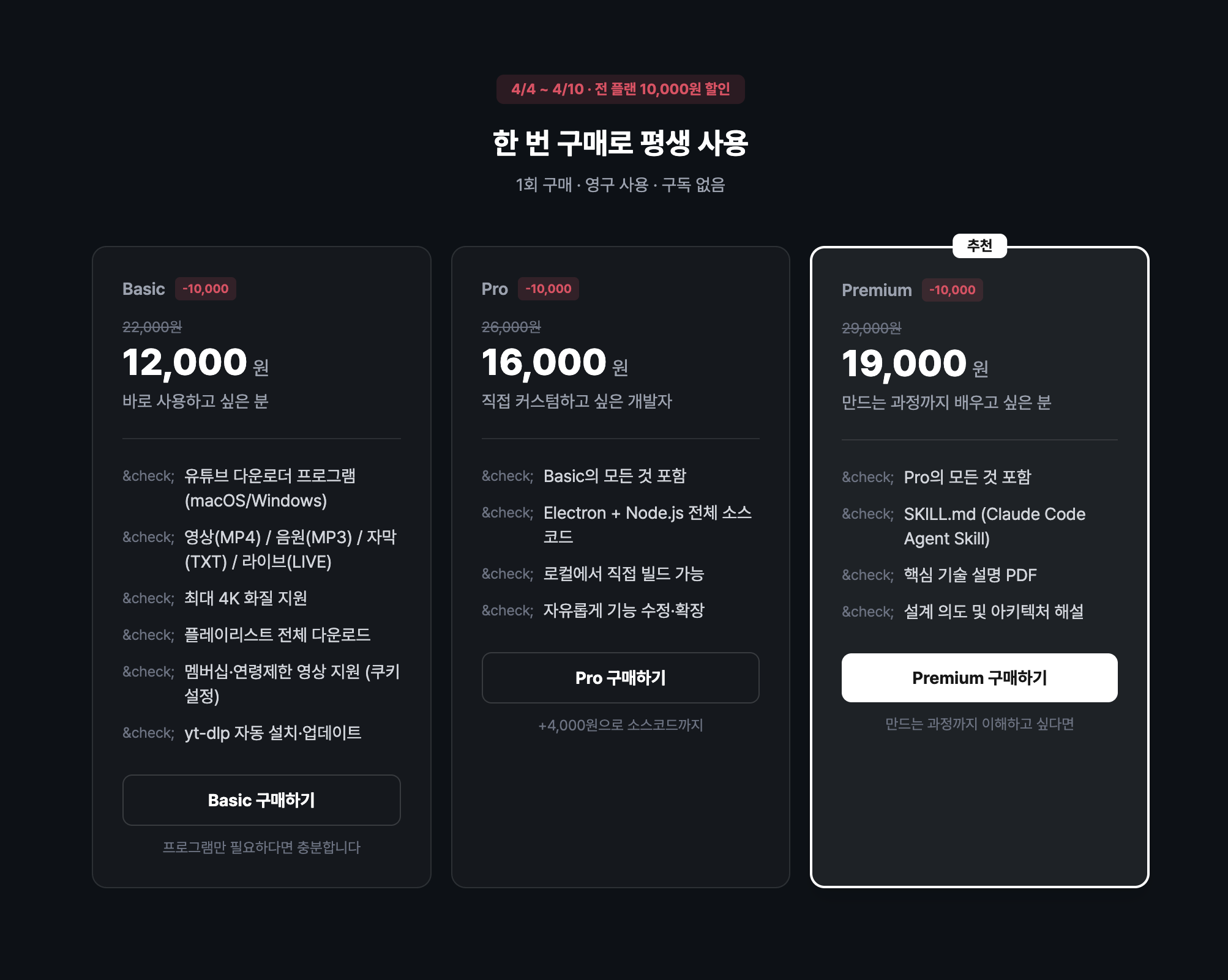 Premium의 SKILL.md가 핵심입니다. Claude Code Agent Skill 파일인데, 이걸 넣으면 Claude Code가 같은 유튜브 다운로더를 바이브코딩으로 만들어줍니다. 프로그램 하나를 사는 게 아니라 만드는 능력을 사는 것.